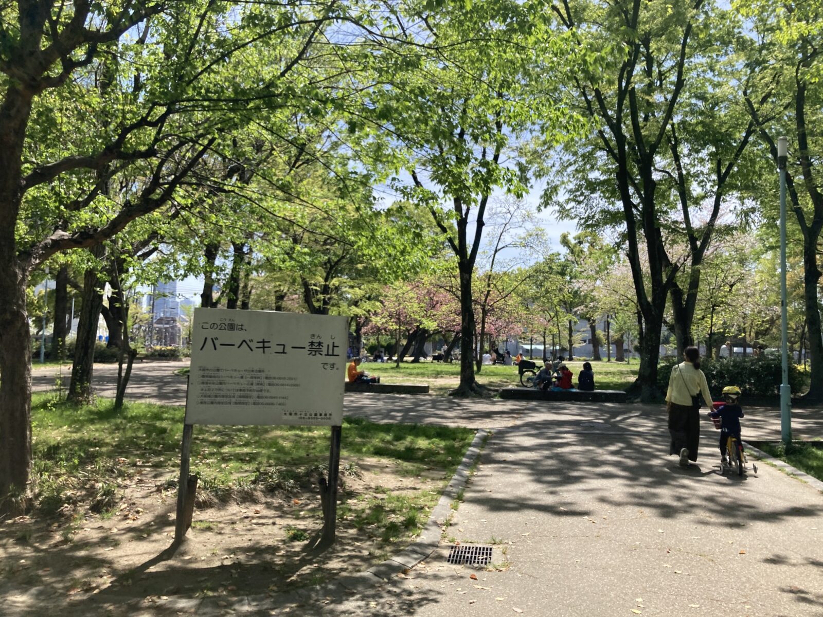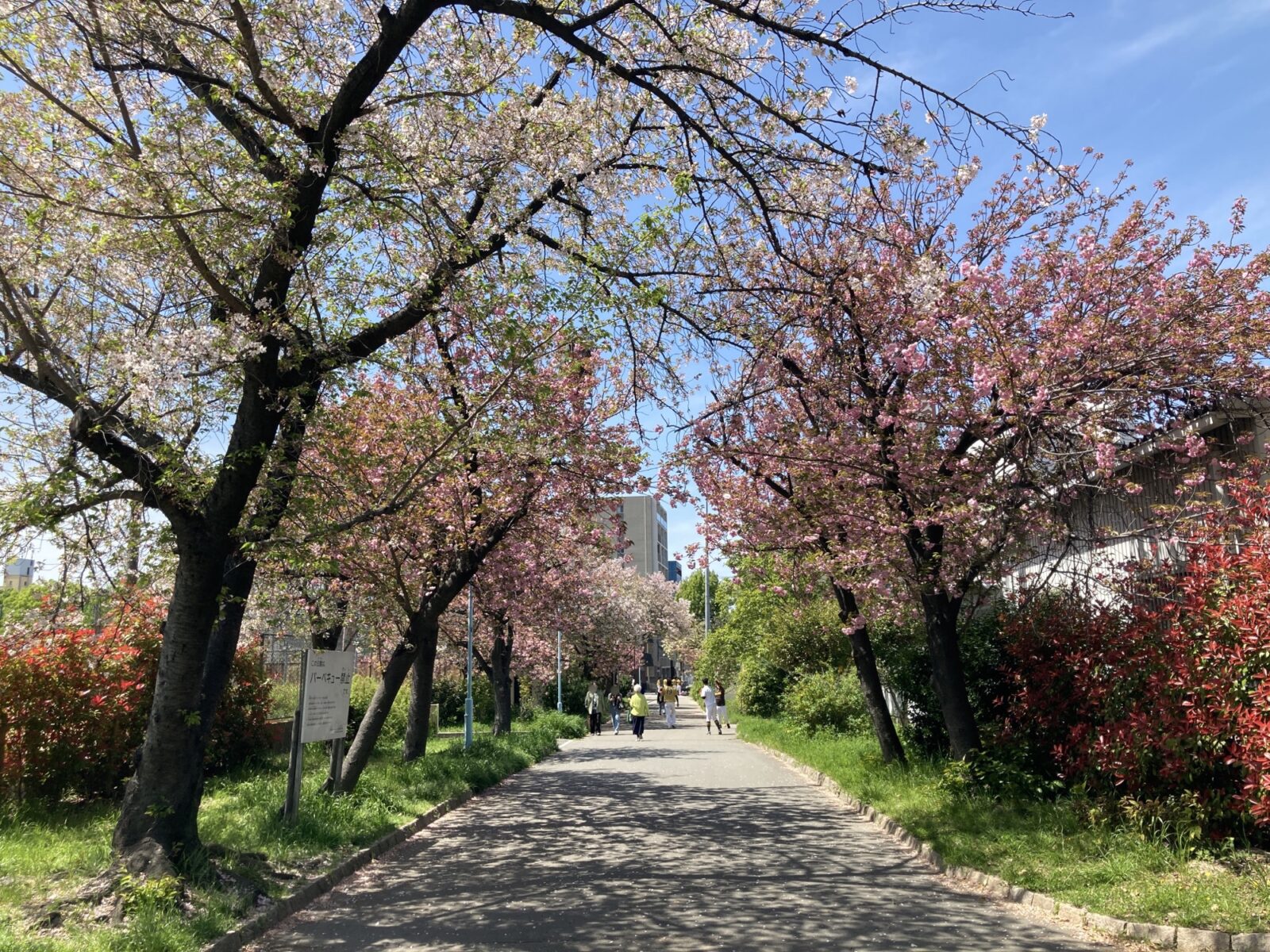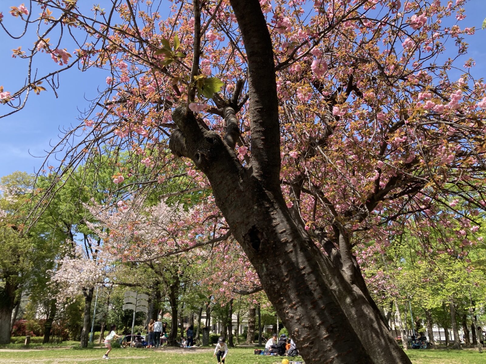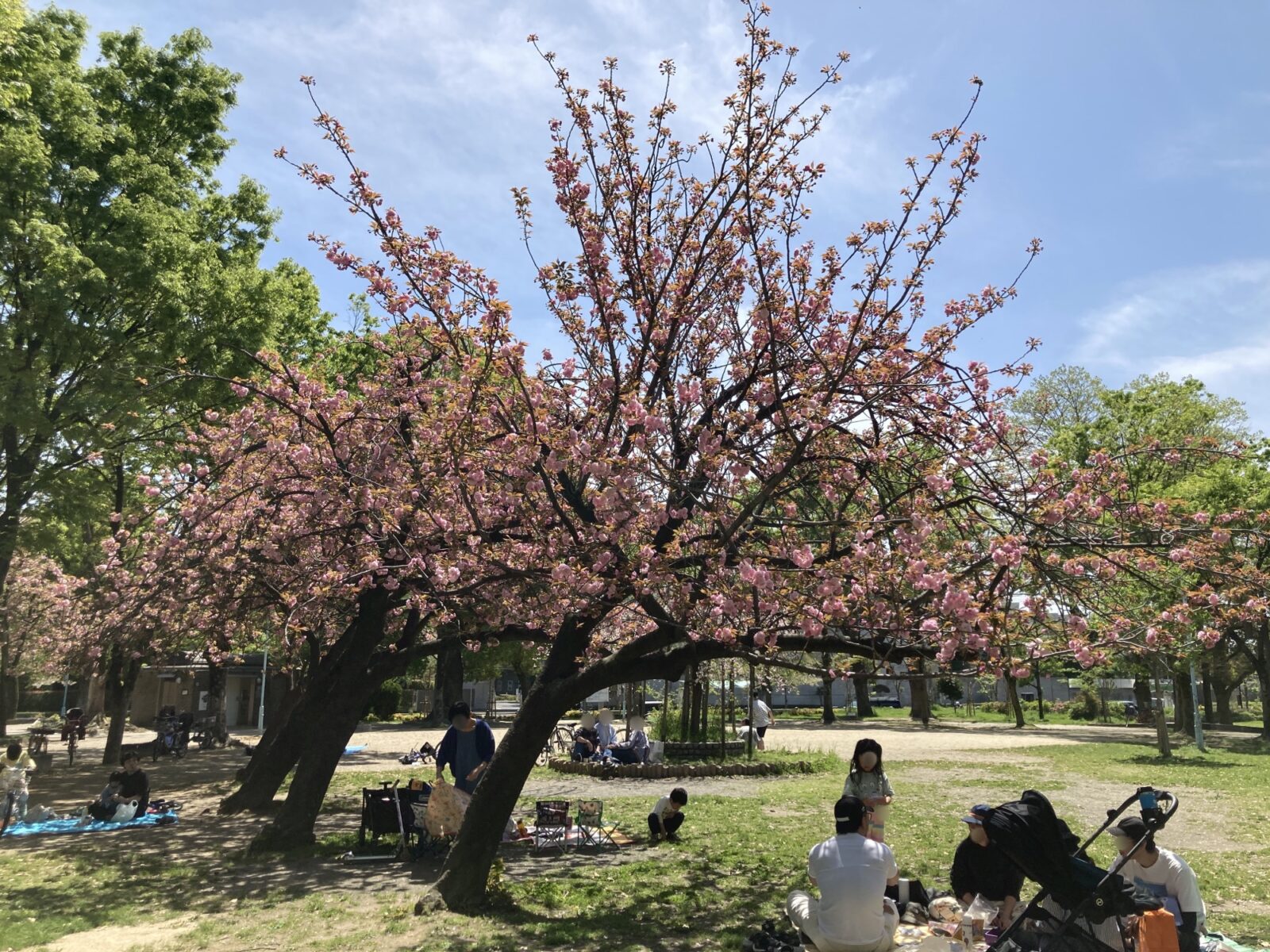 ソメイヨシノが満開になるピーク時の混雑に比べると、八重桜の時期は少し落ち着いているのが嬉しいポイント。ベンチに座ってゆっくりと花を眺めたり、お子様を遊具で遊ばせながらお花見を楽しむのにぴったりです。近くの商店街やコンビニで、お気に入りのおやつやドリンクをテイクアウトして「プチピクニック」をするのも最高ですね!(十三公園でのBBQは禁止です)。
