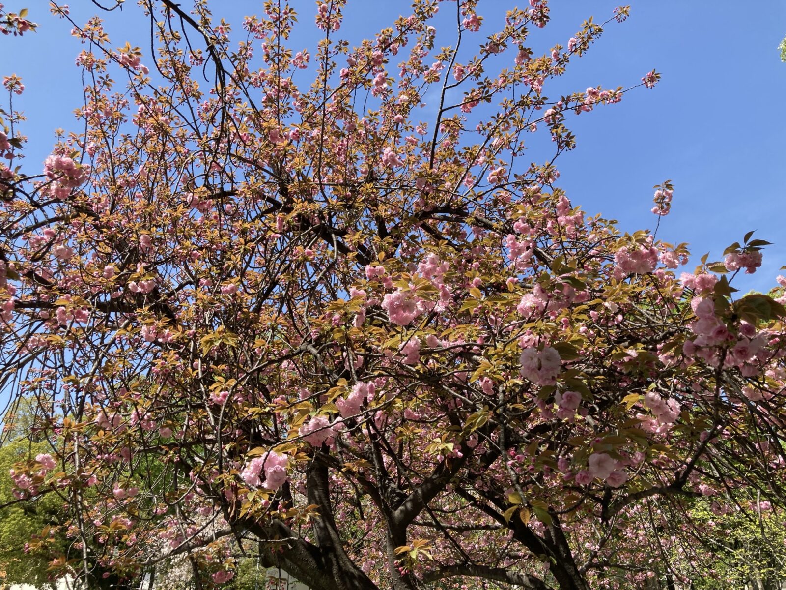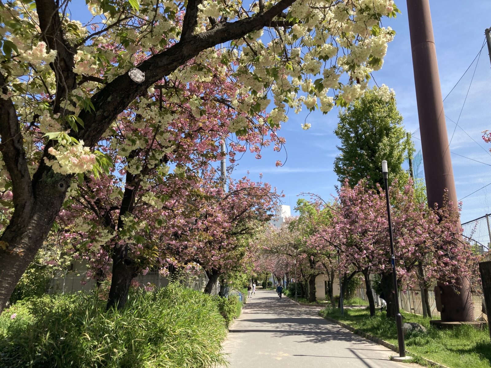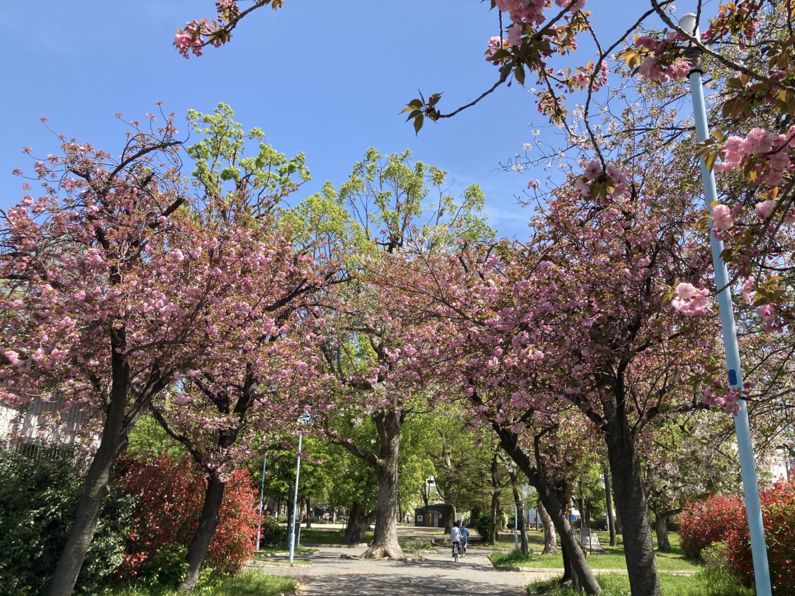 しかし、十三の春はまだまだ終わりません! 阪急十三駅から歩いてすぐ、十三民の憩いのオアシス「十三公園」では、今まさに「八重桜(ヤエザクラ)」がまもなく満開を迎えようとしています!