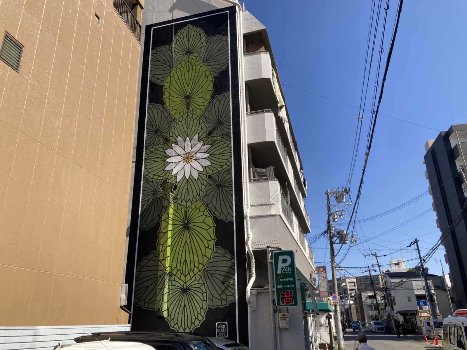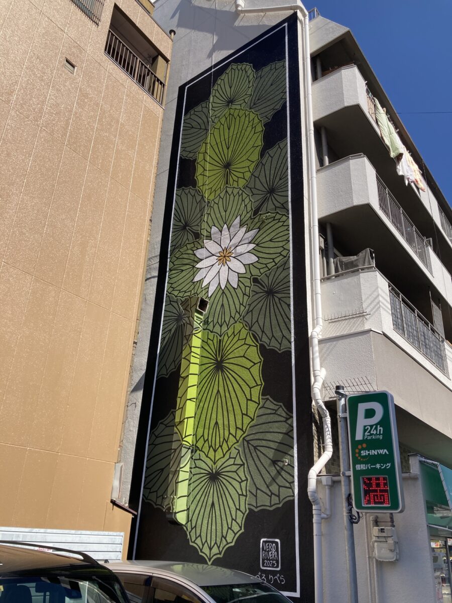 プエルトリコの”VERO RIVERA”さんは、彼女の原風景である植物をシンメトリーに描くアーティストです。幼少期に日本の文化に触れていた事もあり、下町の景観ともマッチした睡蓮(スイレン)をテーマにした作品が完成しています。