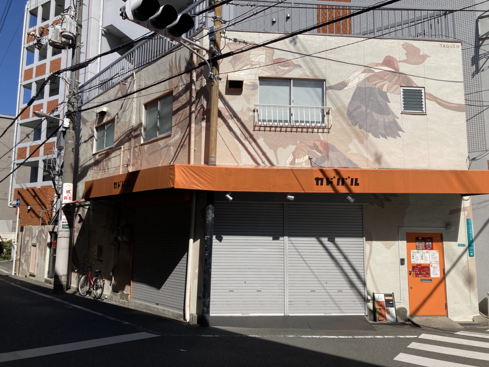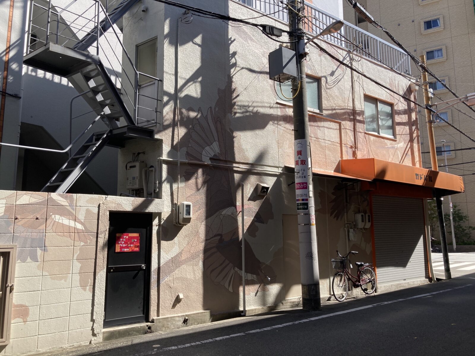 スペインのマドリードを拠点とする”TAQUEN’さんは、繊細なタッチで、大阪府の鳥である百舌鳥(モズ)を描かれています。全体的に淡い色彩で構成されており、良い意味で主張しないながらも躍動感あふれる表現で描かれた繊細な百舌鳥は、街の雰囲気にも溶け込んでいるアート作品になっています。
