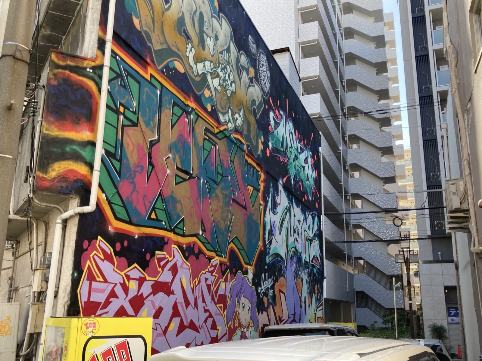 大阪の重鎮グラフィティライター6名による合作壁画になります。淀壁としても国内シーンを越境した壁画として記念碑的な作品となるそうです。ここは常に車が停車している事が多いので、全体を撮れるチャンスが非常にレアですが、それも含めてウォールアートの良さなのだと思います!6名のアーティストによるグラフティは圧巻です!