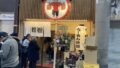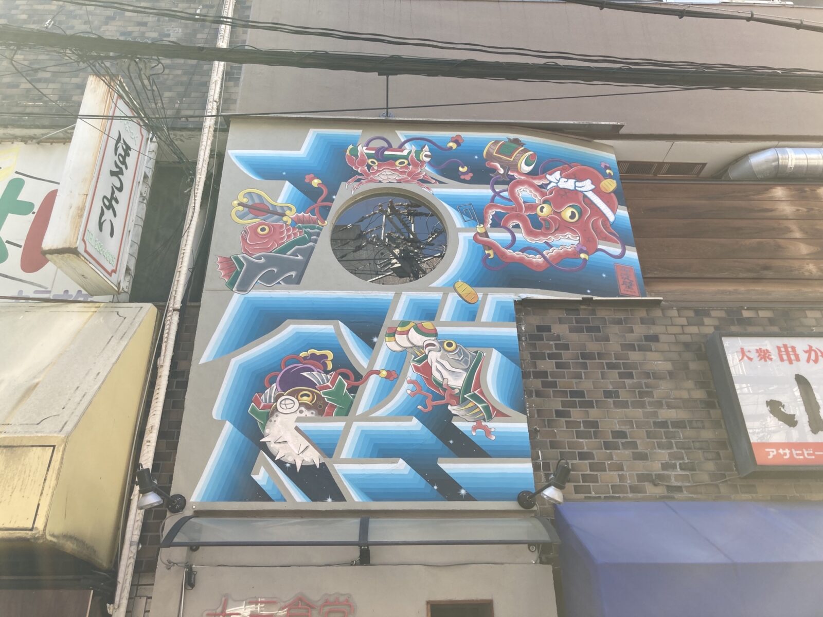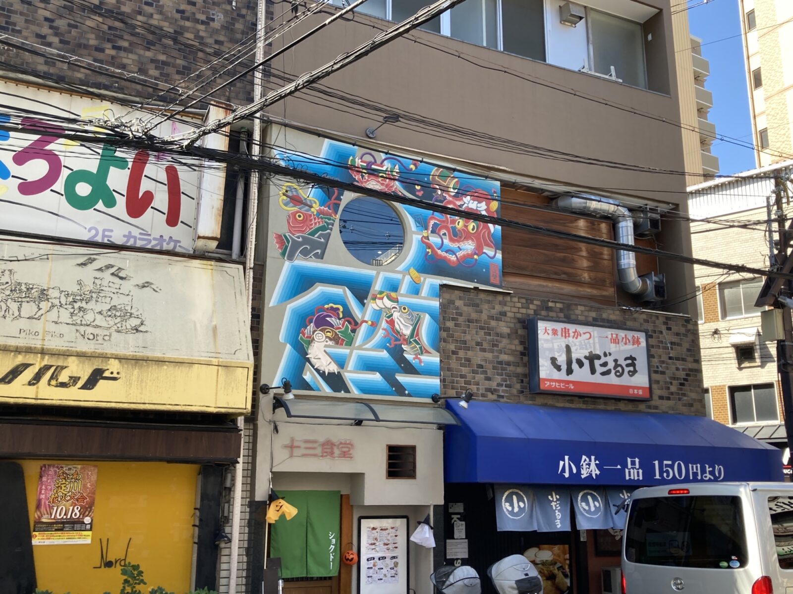 京都の二人組ペインター”ATTACK THA MOON”による作品。竜宮城をイメージしたおめでたい壁画が描かれています。浮世絵に着想を得たTAKUJIによるグラフィカルな魚たちと、没入感のあるグラデーションが美しい中LAによる「十三食堂」を表現したタイポグラフィになっています。
