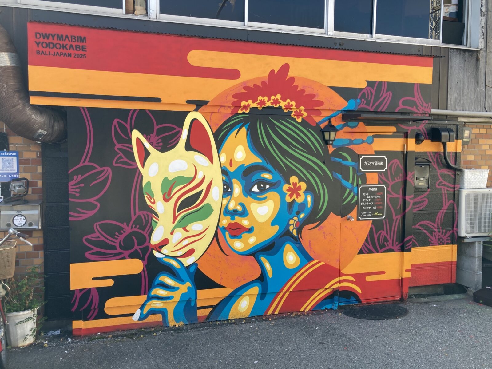 インドネシアのバリ島で”TANGI STREET ART FES”を主催している”DWYMABIM”さんは、淀壁とのトレード企画で十三にウォールアートを描きにこられたのだとか。ポップな色彩感覚でDwymabimさんのシグネイチャーである女性が狐面や簪を携え、バリと日本のカルチャーの融合を表現されています。