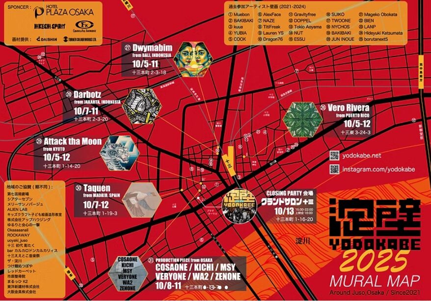以上が今回の「淀壁2025」で新たに描き起こされた新作ウォールアート6点になります。淀壁2025年の作品は、阪急十三駅周辺エリアを中心に制作されているので、徒歩でも十分に見て回れる様になっています。